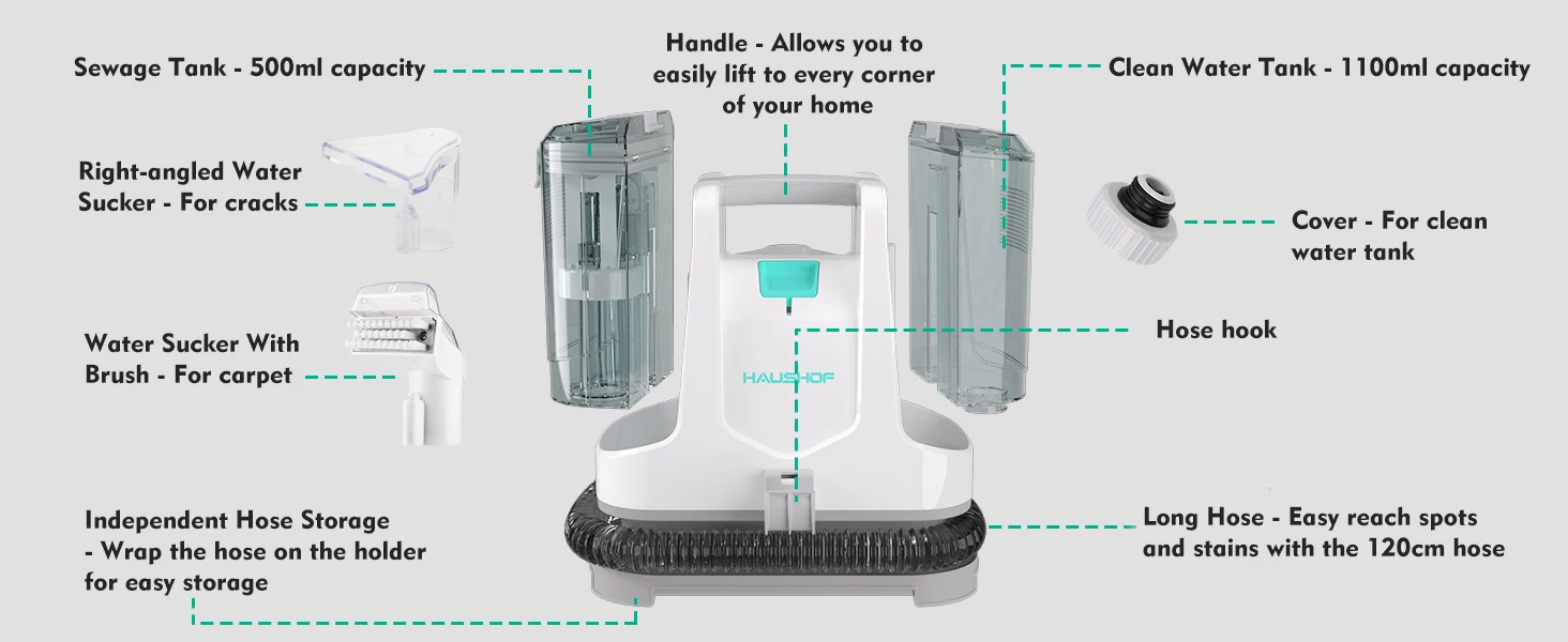 Long Reach And Versatile Tools: Easily Reach Spots And Stains On Carpet, Stains, And More With The 4 Ft Hose And 10 Ft Power Cord. You'Ve Got The Tools For Every Mess, The Water Sucker With Brush Combines Brush And Suction For Deep Cleaning, And The Extra Right-Angled Water Sucker Can Clean Cracks And Hard-To-Reach Areas